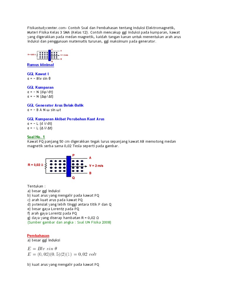 Contoh Soal Fisika Induksi Elektromagnetik Dan Pembahasannya. Contoh soal induksi elektromagnetik dan pembahasan. Menentukan ggl induksi pada kawat yang di gerakan menggunakan persamaan ε = b l v sin q keterangan ε = ggl induksi (volt) b.